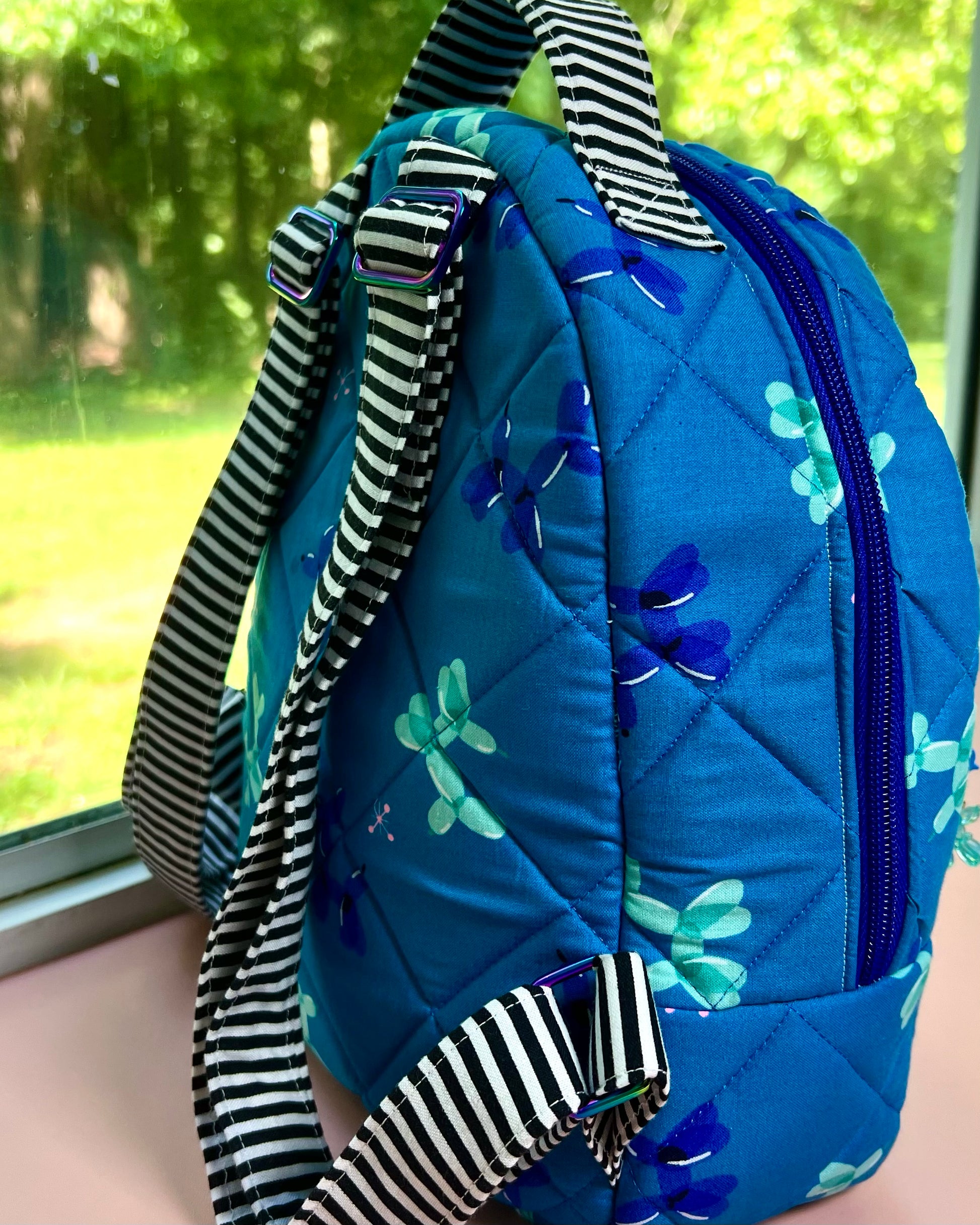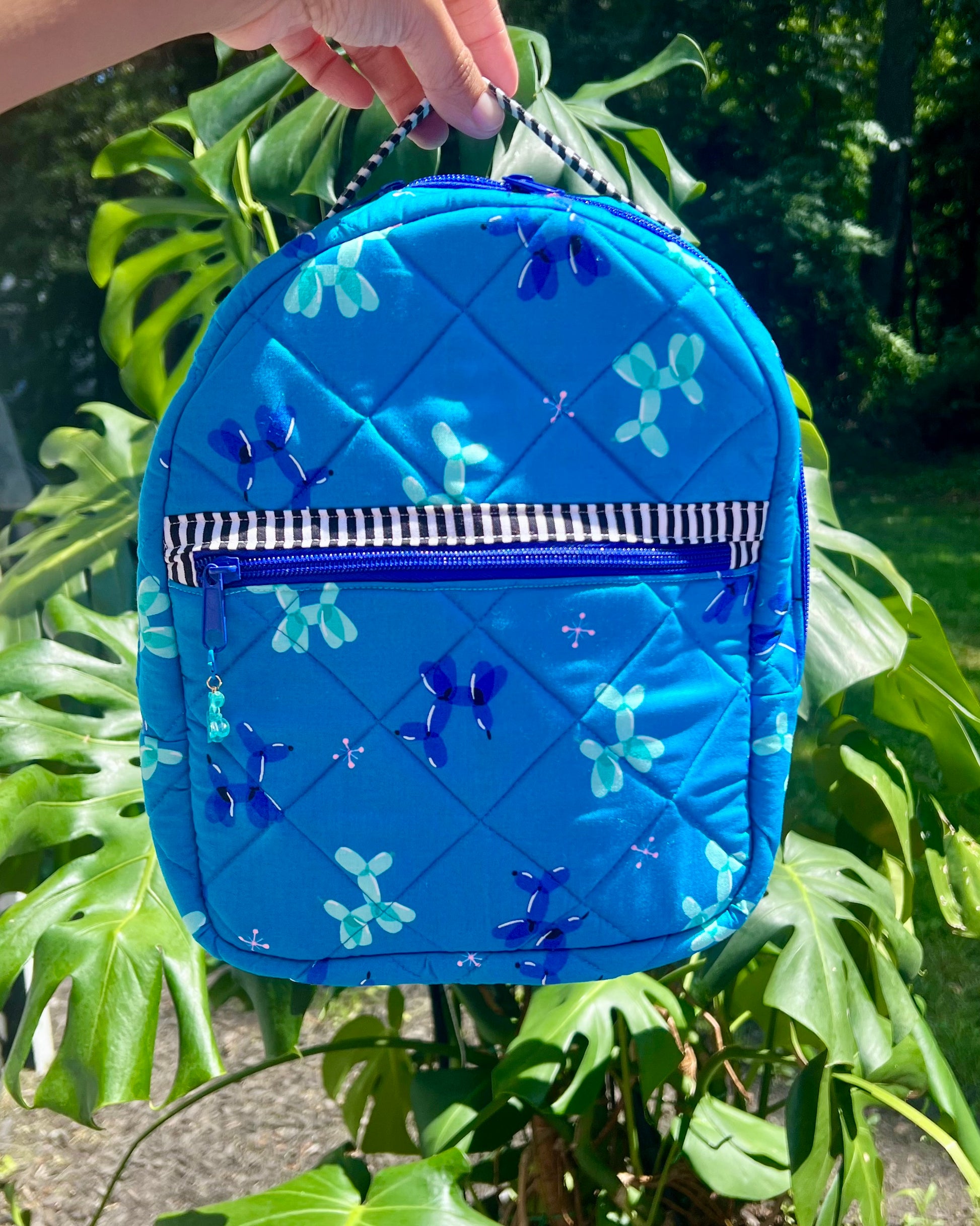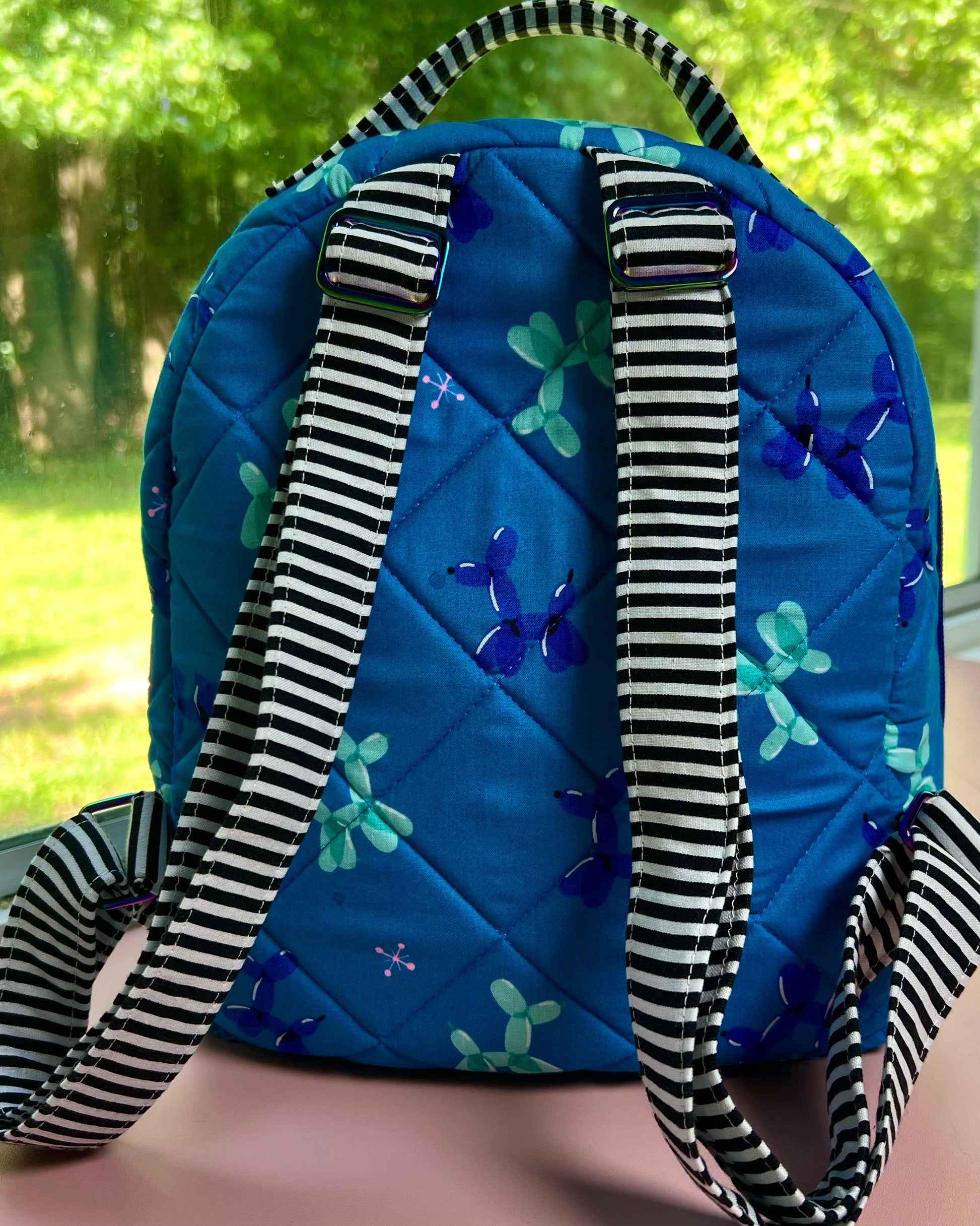 Step into the fun with The Carnival Pup Backpack, where whimsy meets vibrant style. Covered in cheerful blue balloon dog prints, accented by bold black-and-white striped straps and pockets, and lined with a lively speckled fabric, this mini backpack is ready for every adventure and memory yet to be made.