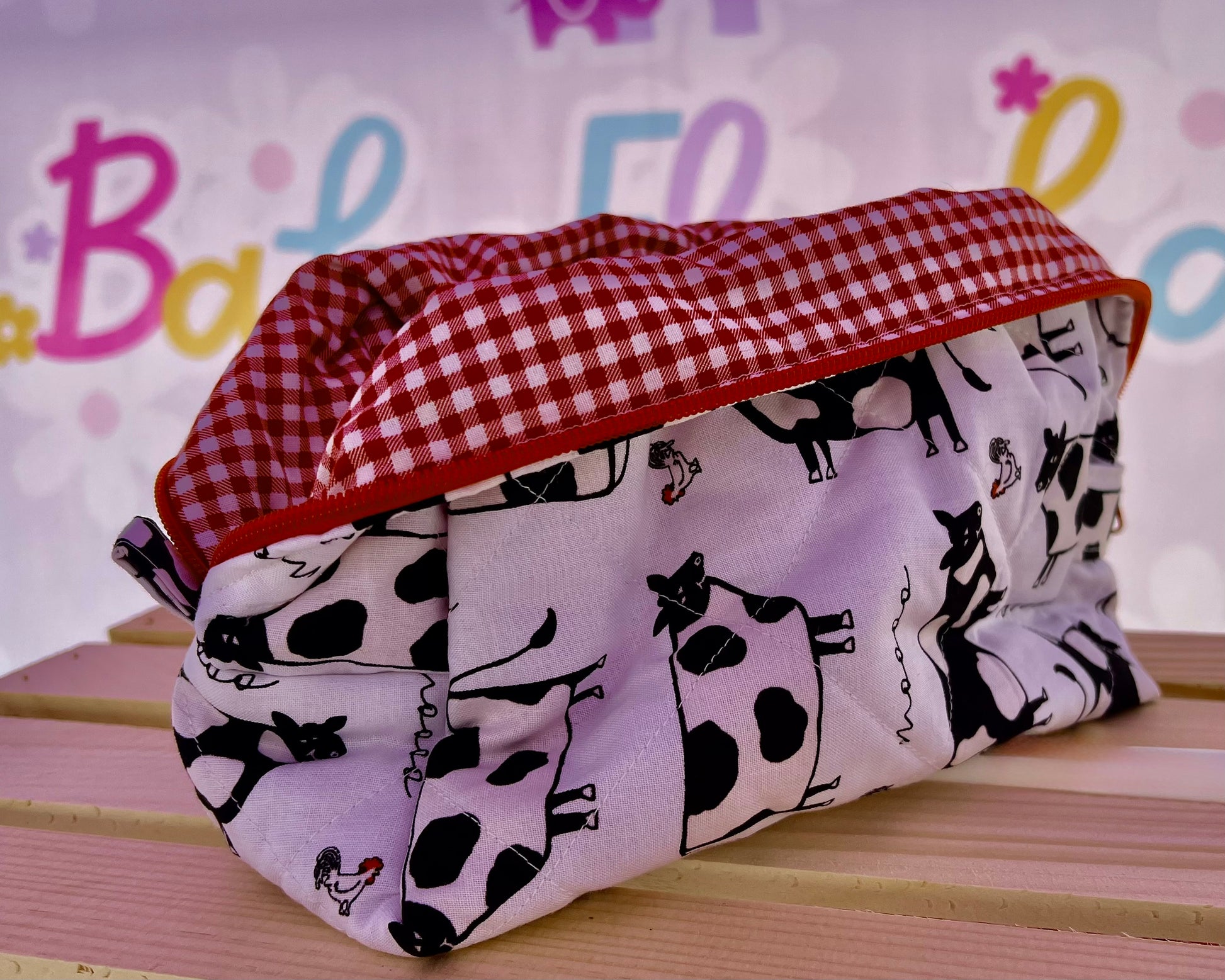 Start your busy days with a little joy and a lot of charm! mommy makeup bag brings a whimsical touch to your everyday routine. Handcrafted with love, this roomy quilted bag features a playful cow and chicken print, a bold red zipper for easy access, and plenty of space for all your makeup must-haves (and a few toddler snacks too — we won't judge!). Perfect for tossing in your diaper bag, keeping on the counter, or gifting to your favorite mama.