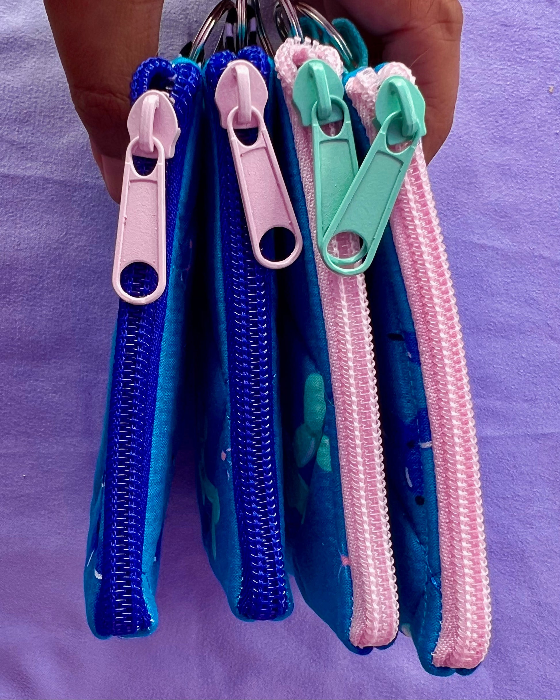 These mini quilted keychain wallets are small in size but big on personality. Each one is crafted with care and bursting with color — from the vibrant zipper tape and playful zipper pulls to the surprise pop of binding on the inside. Clip one onto your keys, backpack, or tote and keep your cards, cash, and tiny must-haves close at hand in style.