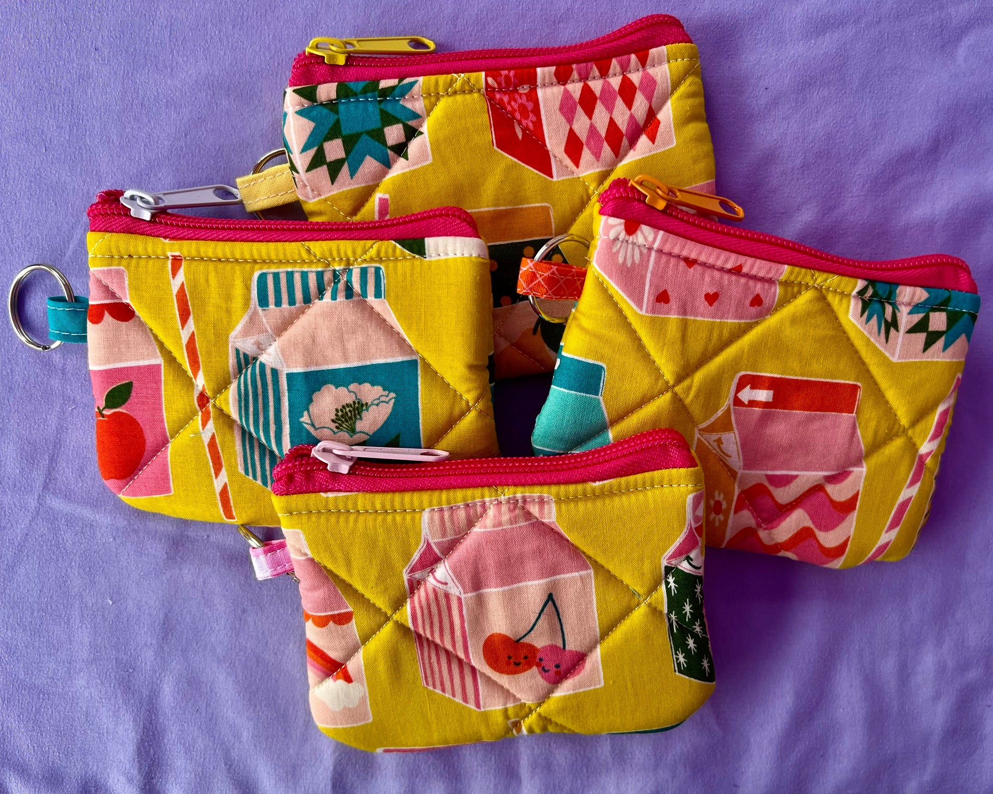 These mini quilted keychain wallets are small in size but big on personality. Each one is crafted with care and bursting with color — from the vibrant zipper tape and playful zipper pulls to the surprise pop of binding on the inside. Clip one onto your keys, backpack, or tote and keep your cards, cash, and tiny must-haves close at hand in style.